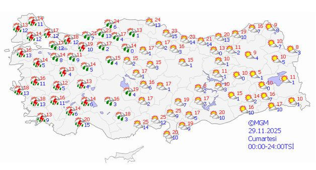 Meteoroloji Genel Müdürlüğü, 29 Kasım 2025 Cumartesi günü için son hava durumu raporunu açıkladı. Meteoroloji'den alınan bilgiye göre Ege ve Akdeniz bölgelerinde yağışın kuvvetli olacağı belirtildi ve 8 kent için 'turuncu' ile 'sarı' kodlu uyarı yayınlandı. Sıcaklık, mevsim normallerinin üzerinde seyredecek.