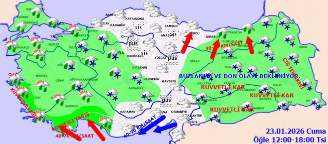 Meteoroloji, 23 Ocak Cuma günü için hava durumu raporunu yayımladı. 23 il için sarı kodlu uyarı yapılırken; Çanakkale, Edirne, İstanbul, Kırklareli, İzmir, Manisa, Adana ve Antalya'da sağanak, Afyonkarahisar, Denizli, Hatay, Isparta, Ankara, Çankırı, Eskişehir, Kayseri, Bolu, Amasya, Rize, Samsun, Trabzon, Erzurum, Kars, Malatya, Van, Batman, Diyarbakır, Gaziantep ve Siirt'te karla karışık yağmur ve kar yağışı bekleniyor. Hava sıcaklıklarının kuzey, iç ve batı kesimlerde artması bekleniyor.